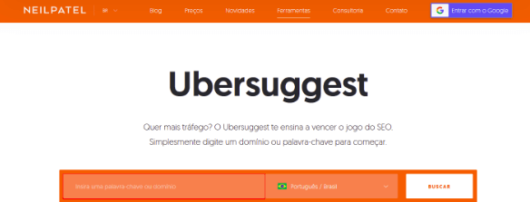 Começando com o acesso à Ubersuggest, que é muito simples. Por exemplo, basta acessar o site neilpatel.com/br/ubersuggest/ e você encontrará a página principal da plataforma: